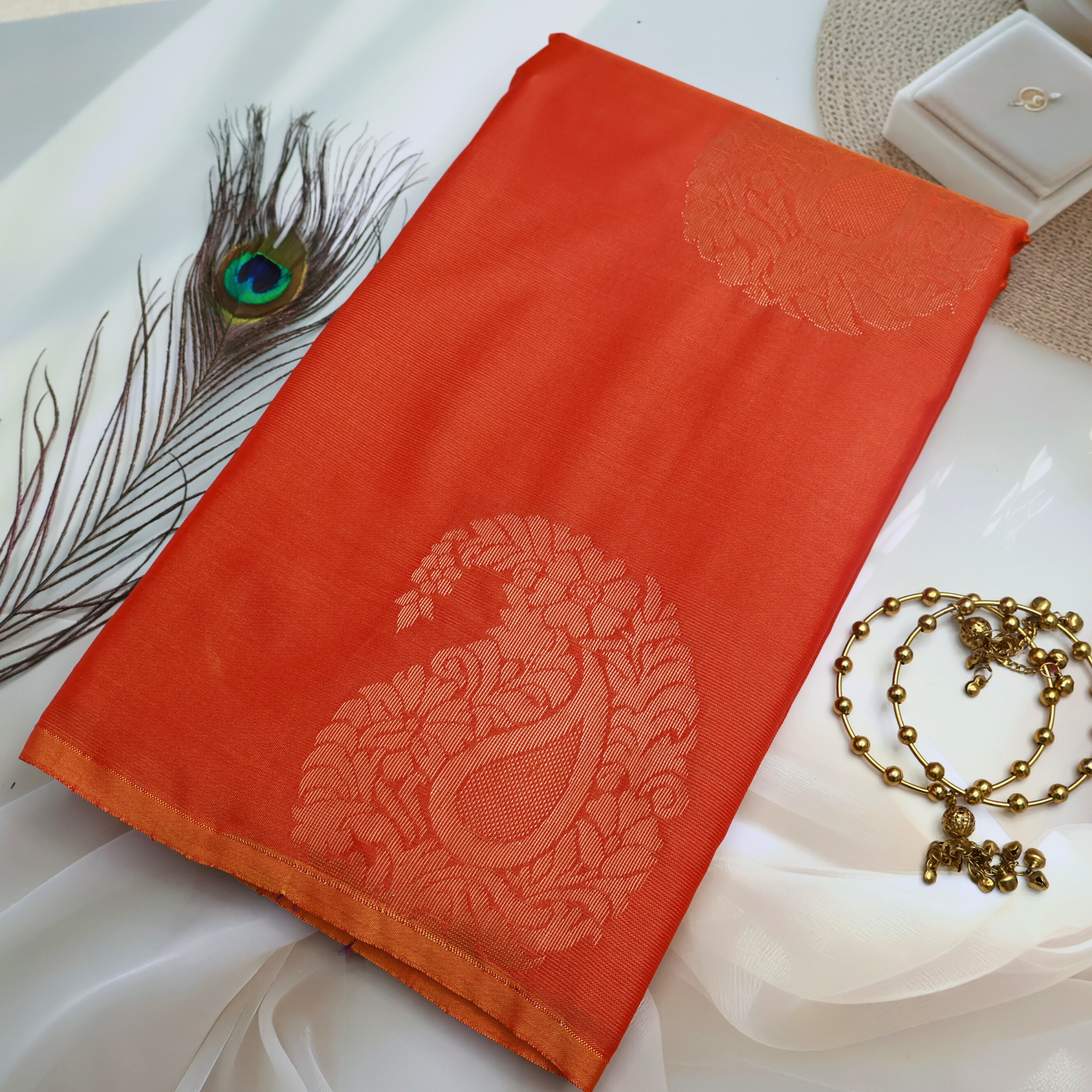 This captivating soft silk saree showcases a vibrant orange body with intricate paisley motifs, exuding charm and elegance. The pallu contrasts beautifully in a rich purple tone, adorned with delicate floral patterns that enhance the saree's traditional appeal. Lightweight and comfortable, this saree is perfect for festive occasions, weddings, or everyday wear with a touch of sophistication.