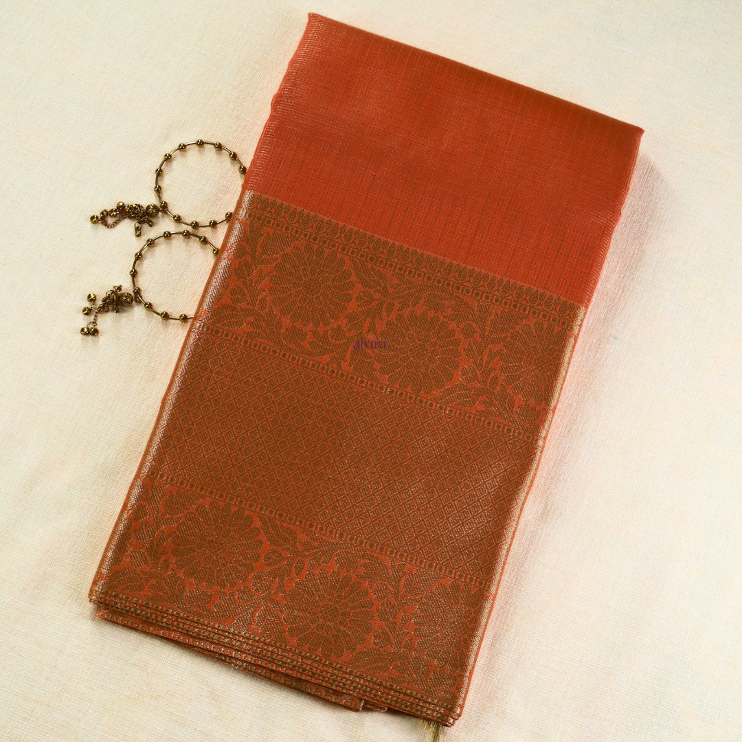 Tissue sarees are crafted from finely woven silk, creating a lightweight yet lustrous fabric that drapes beautifully. Known for their subtle sheen and delicate texture, these sarees feature intricate zari work that enhances their elegance. Ideal for weddings and festive events, tissue sarees bring a touch of timeless grace to any occasion.