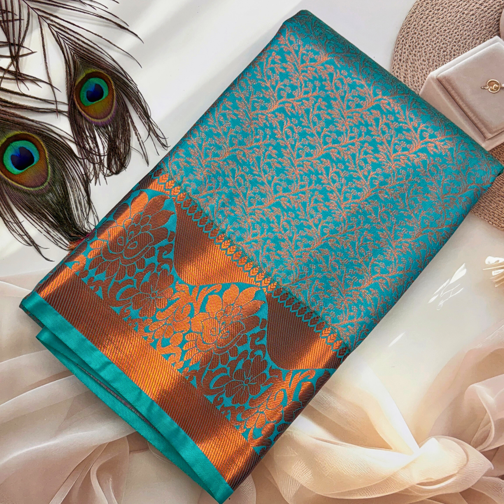 - Border: Golden zari floral motifs on a contrasting teal border.