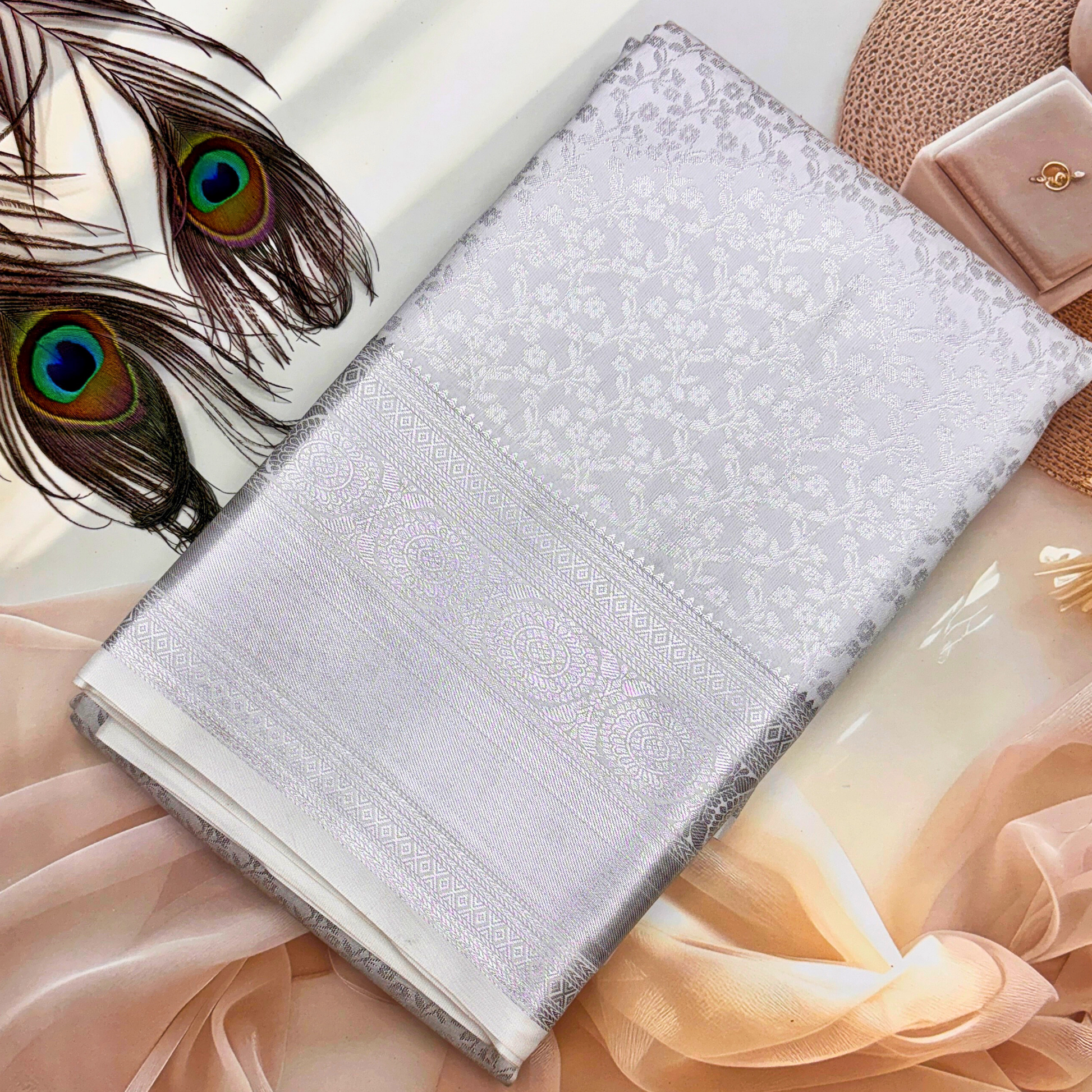 - Saree Color: Radiant silver with intricate floral and geometric zari detailing.