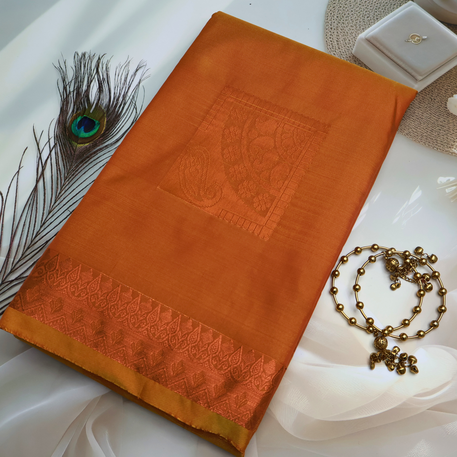 This sophisticated rust orange soft silk saree is perfect for those seeking elegance in everyday wear. The body is adorned with subtle copper-toned square motifs, while the pallu features a contrasting green geometric floral design that adds a vibrant touch. Lightweight and easy to drape, this saree ensures both comfort and style.