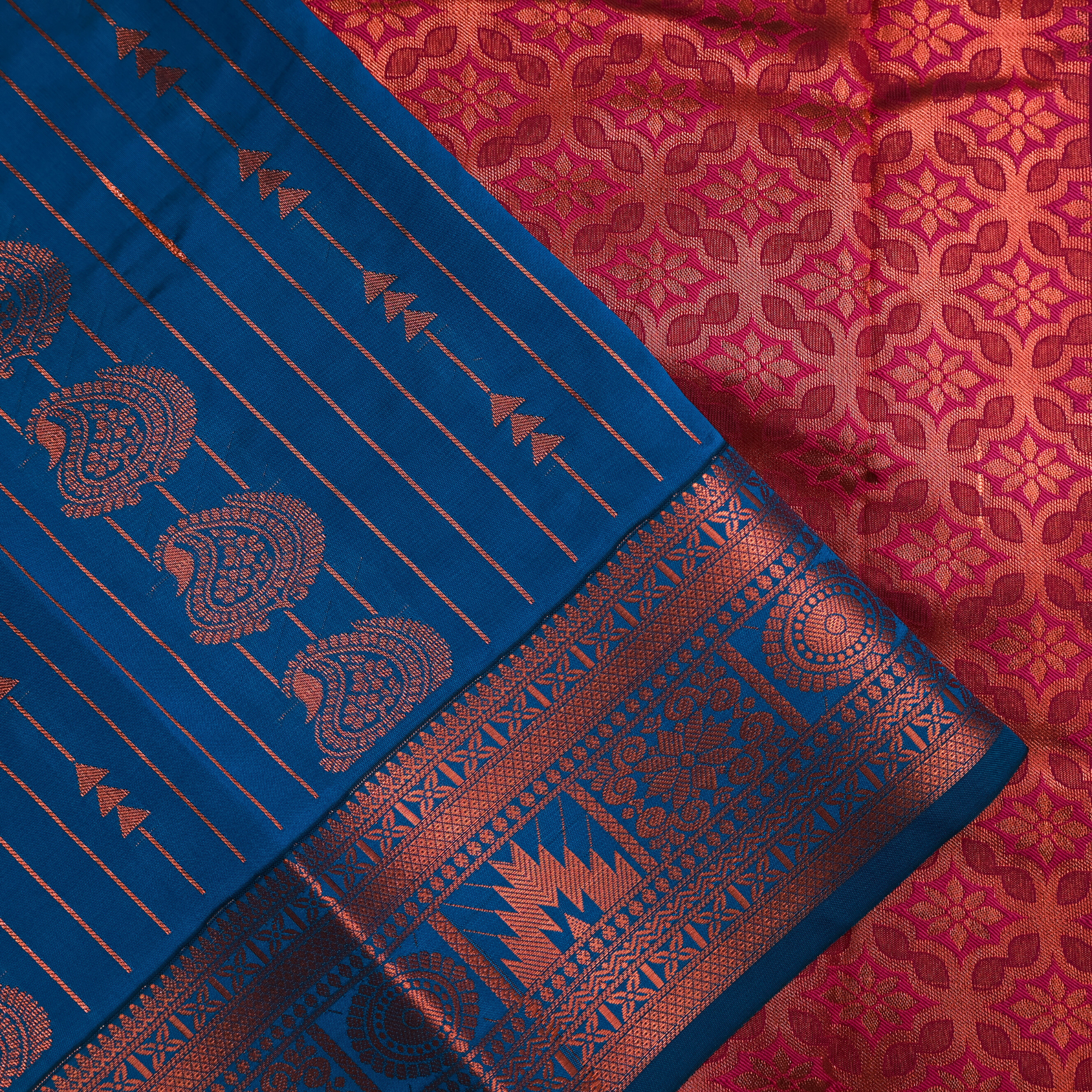 This elegant handloom Kanjivaram saree comes in a rich royal blue with intricate copper zari patterns. The saree features a striking red pallu and a matching contrast blouse, adding a vibrant touch. it’s perfect for weddings, festive occasions, and celebrations.